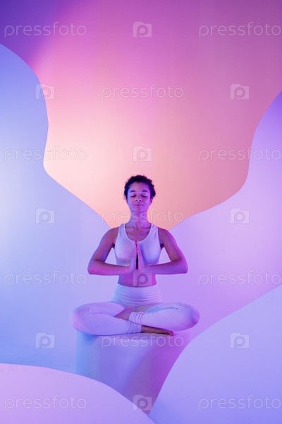 Молодая африканская женщина в спортивном костюме сидит, скрестив ноги, в позе медитации на круглой платформе