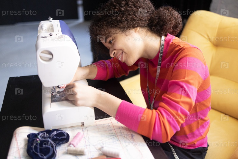 Молодая африканская женщина работает на швейной машинке. Очаровательная черная девушка в красном свитере