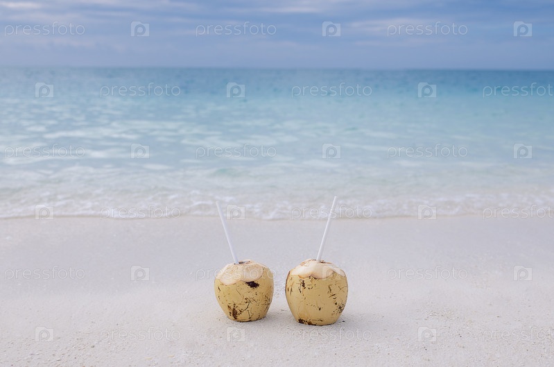 Крупный план двух кокосов с соломинками на берегу океана. Вкусные натуральные коктейли на фоне чистой голубой морской воды. Красивый морской пейзаж и тропические напитки