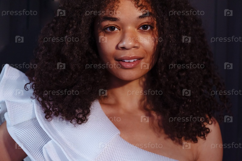 Портрет крупным планом молодой смеющейся африканской женщины в помещении. Милая черная девушка улыбается