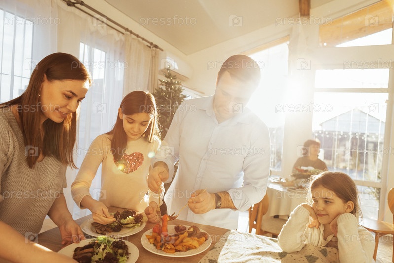 Родители и дети готовят праздничный обед дома в столовой. Молодой папа, привлекательная мама и их милая дочь-подросток готовят. Счастливая семья