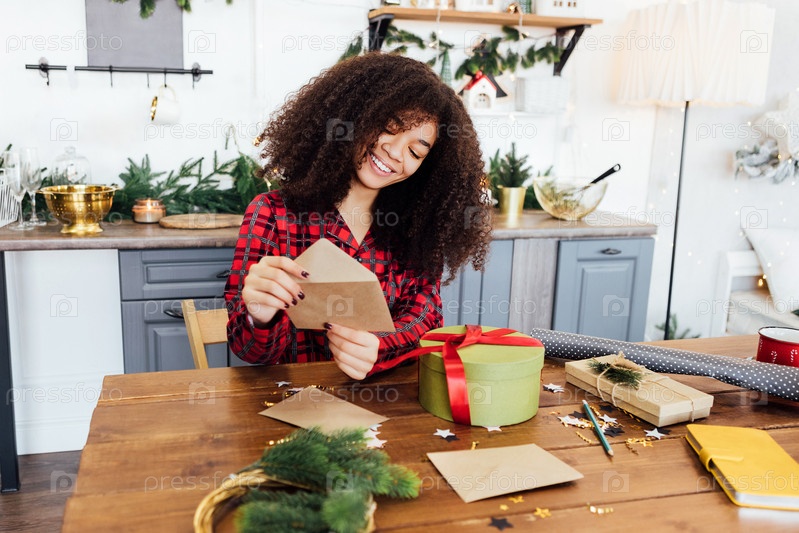 Милая африканская женщина в пижаме улыбается и упаковывает поздравительные открытки в конверты. Очаровательная черная девушка упаковывает новогодние подарки за столом на кухне. Уютный домашний интерьер с рождественскими украшениями