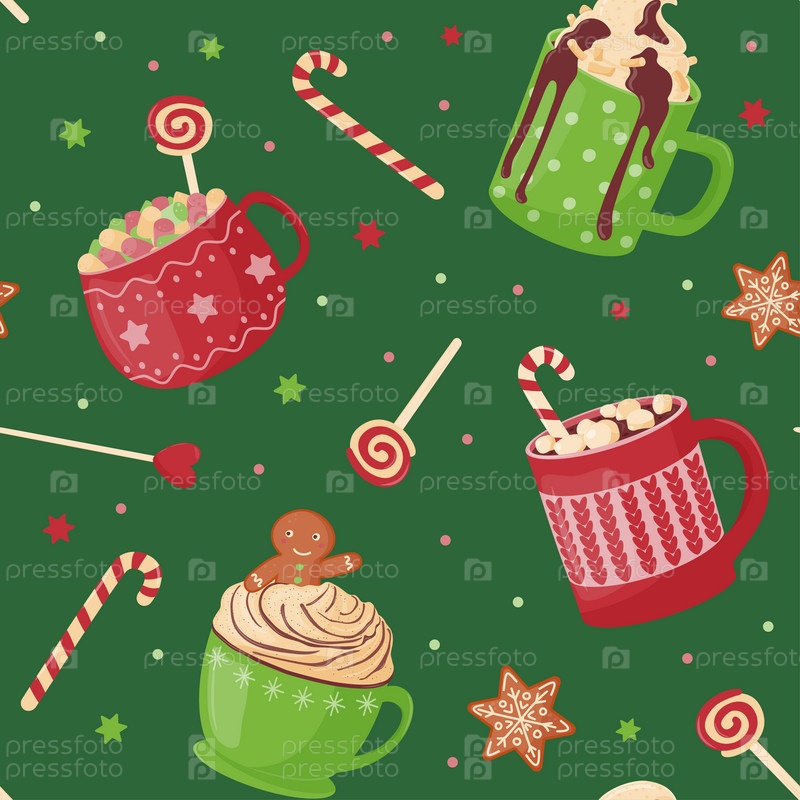 Бесшовный узор. Праздничные милые кружки с горячим какао, кофе, шоколадом, взбитыми сливками, зефиром и сладостями