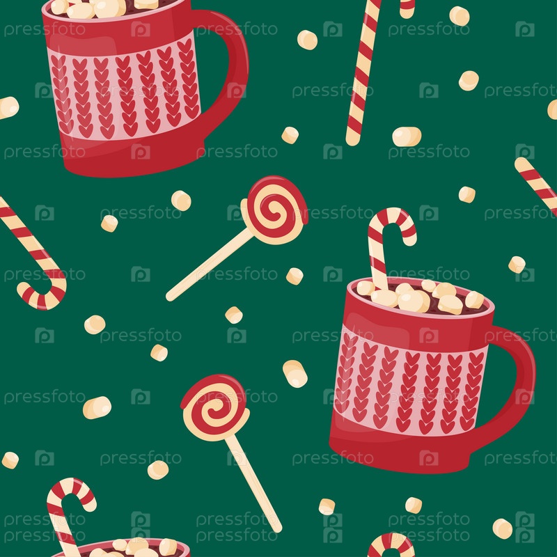 Бесшовный узор. Праздничные милые кружки с горячим какао, шоколадом, зефиром и сладостями