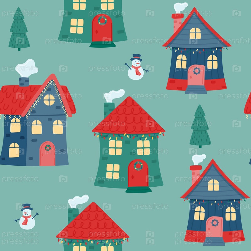 Бесшовный узор из разноцветных домиков, снеговиков и елей