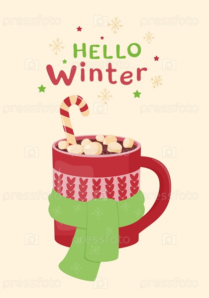 Поздравительная открытка с какао с зефиром и леденцом в красном стаканчике, перевязанном теплым шарфом