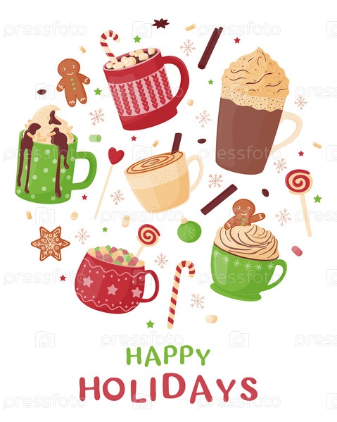 Рождественский набор горячих напитков. Праздничные милые кружки с горячим какао, кофе, шоколадом, взбитыми сливками, зефиром и конфетами