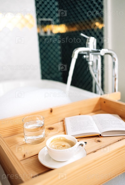 Деревянный поддон прикреплен к ванне, наполненной горячей ароматной водой с пышной пеной