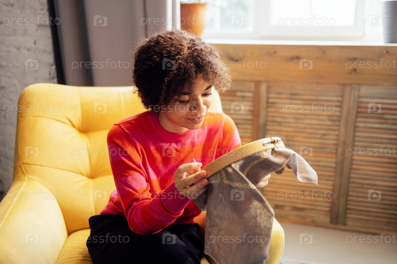 Улыбающаяся молодая африканка в красном свитере вышивает, сидя в кресле