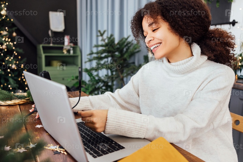 Африканская женщина в свитере сидит за столом с ноутбуком и микрофоном