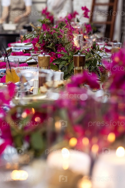 Обеденный праздничный стол украшен яркими розовыми цветами. Расставлены элегантные бокалы и тарелки, мерцают свечи. Вкусные закуски и напитки