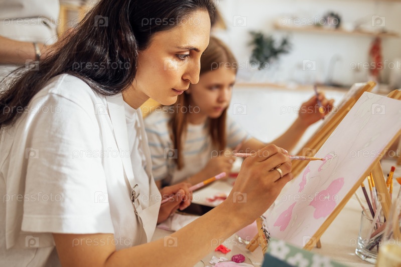 Молодая сосредоточенная женщина в белой футболке и фартуке рисует картину за столом