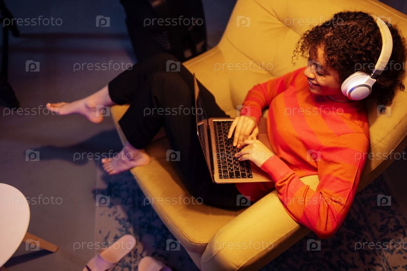 Молодая улыбающаяся африканская женщина сидит в кресле с ноутбуком и слушает музыку в наушниках