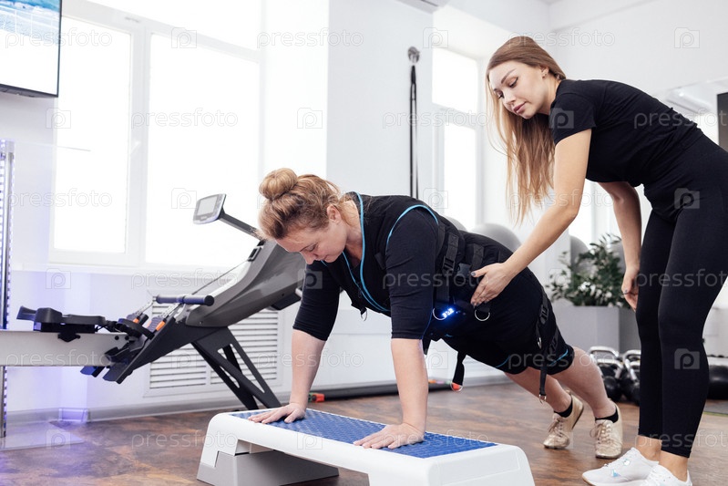 Полная женщина средних лет в костюме для ЭМС занимается на степ-платформе с персональным фитнес-тренером