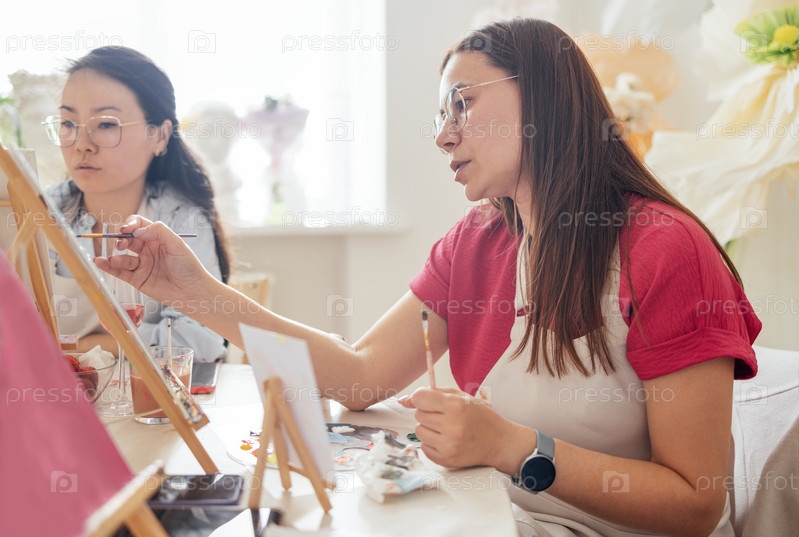 Крупный план молодых женщин в повседневной одежде на занятиях по живописи
