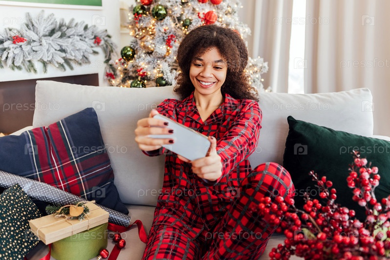 Африканская женщина в пижаме сидит на диване и делает селфи с телефоном. Улыбающаяся черная девочка в уютной гостиной с рождественскими украшениями и упакованными подарками