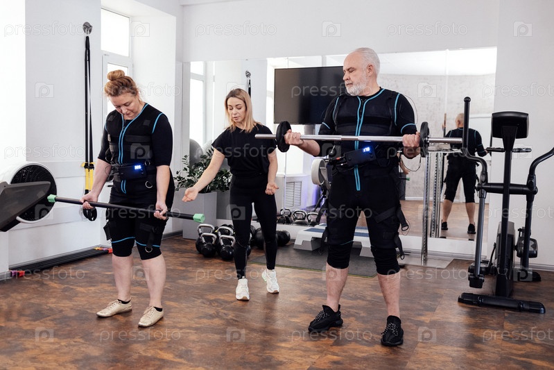 Пожилая спортивная пара занимается электростимуляцией мышц в тренажерном зале с персональным тренером