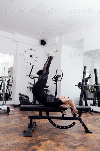 Спортивная подтянутая девушка в черной спортивной одежде выполняет физические упражнения на универсальной скамье для тренировки пресса