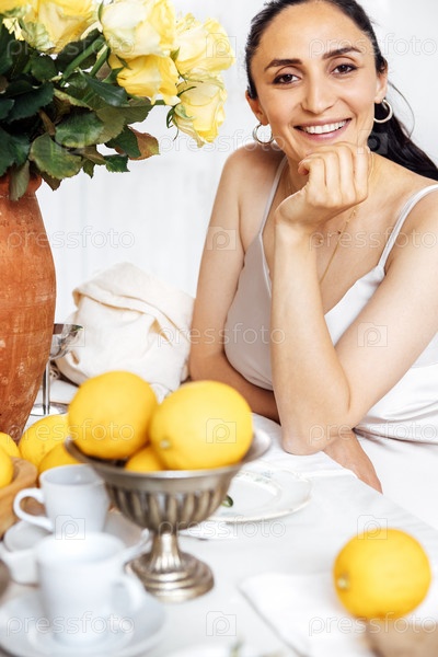 Молодая женщина сидит и смеется за столом. Желтые розы, кухонные принадлежности и лимоны в вазе с фруктами. Радостная девушка в белом атласном платье. Винтажный интерьер