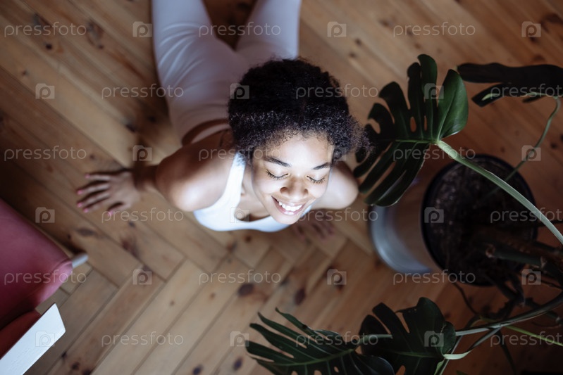 Привлекательный африканец практикует утреннюю йогу. Очаровательная кудрявая черная девушка в фитнес-костюме растягивает свое тело на деревянном полу в гостиной. Вид сверху