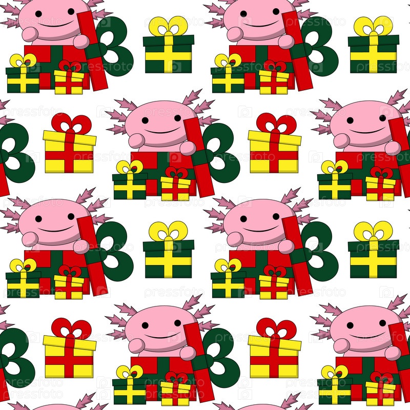 Бесшовный узор с милым рождественским аксолотлем в подарочной коробке