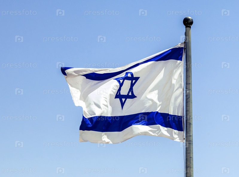Израильский флаг развевается на ярком солнце, его синяя звезда Давида отчетливо видна на белом фоне