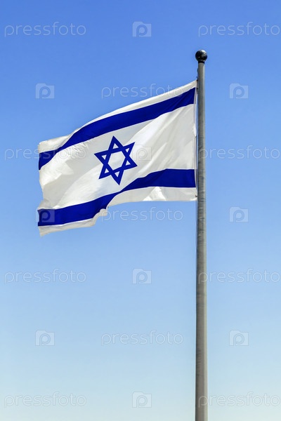 Израильский флаг развевается на ярком солнце, его синяя звезда Давида отчетливо видна на белом фоне