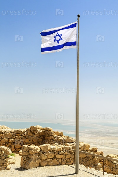 Израильский флаг над руинами крепости Масада в солнечный день