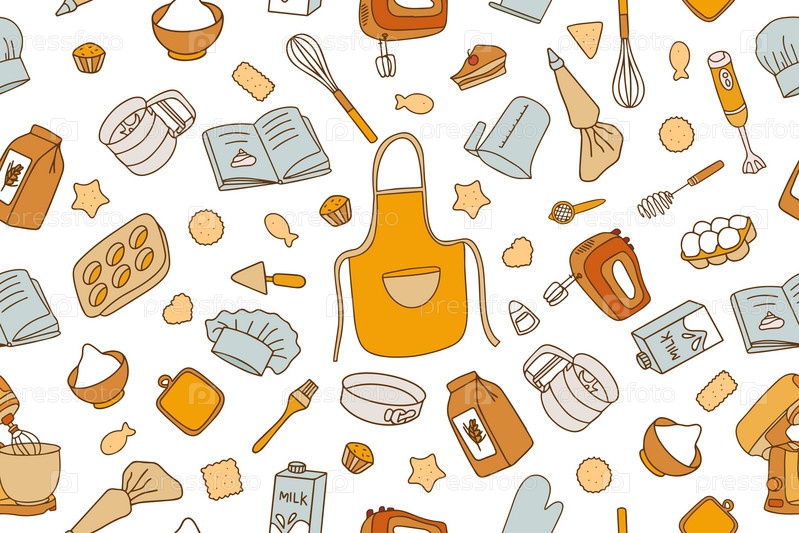 Красочный модный узор аксессуаров для кондитера, повара. принадлежности для выпечки. Набор кухонных принадлежностей для приготовления пищи в стиле каракули на белом фоне. Вектор