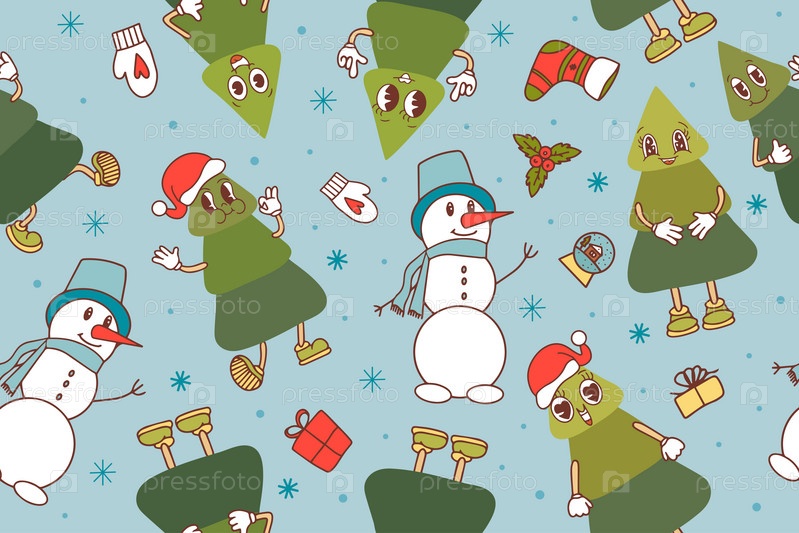 Бесшовный узор из елок и снеговиков. Милые забавные праздничные елки. Синий фон со снежинками. Вектор