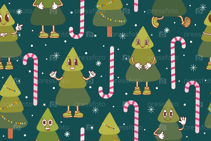 Модный бесшовный рождественский узор с праздничными элементами: кавайные деревья, леденцы, снежинки. Фон с белым снегом и снежинками. Векторная иллюстрация