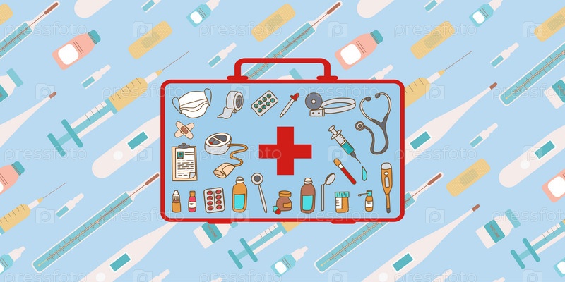 Рисованные медицинские иллюстрации. здравоохранение, аптека, коллекция медицинских икон в стиле doodle. синий фон с медицинскими предметами. вектор