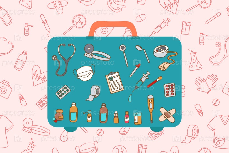 Рисованные медицинские иллюстрации. здравоохранение, аптека, коллекция медицинских икон. розовый фон с медицинскими иконами в стиле doodle. векторная иллюстрация