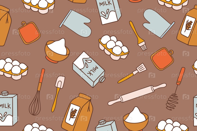 Красочный бесшовный узор из принадлежностей для выпечки. Кухонная утварь в стиле каракули. Фон мусс цвета мокко моды 2025 года