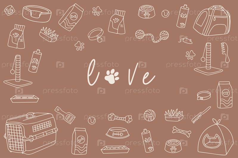 Нарисованный вручную ассортимент зоомагазина в стиле каракули на модном фоне цвета мокко мусс 2025 года. Любовная надпись. Концепция любви к животным