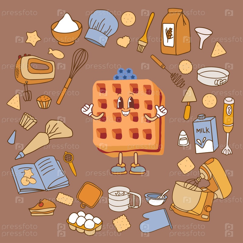 Красочная модная коллекция приборов для выпечки. набор кухонных принадлежностей для приготовления пищи в стиле doodle на фоне Mocha Mouss 2025 года. вектор