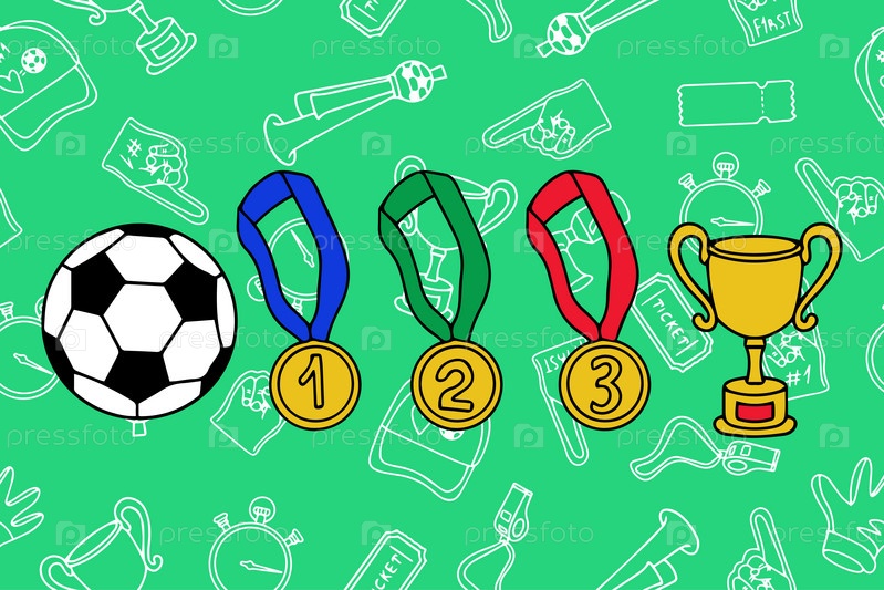 Концепция празднования победы в футболе.Векторная иллюстрация футбольного мяча с золотым кубком и медалями в стиле doodle.Зелёный фон со спортивными значками в стиле doodle.Вектор
