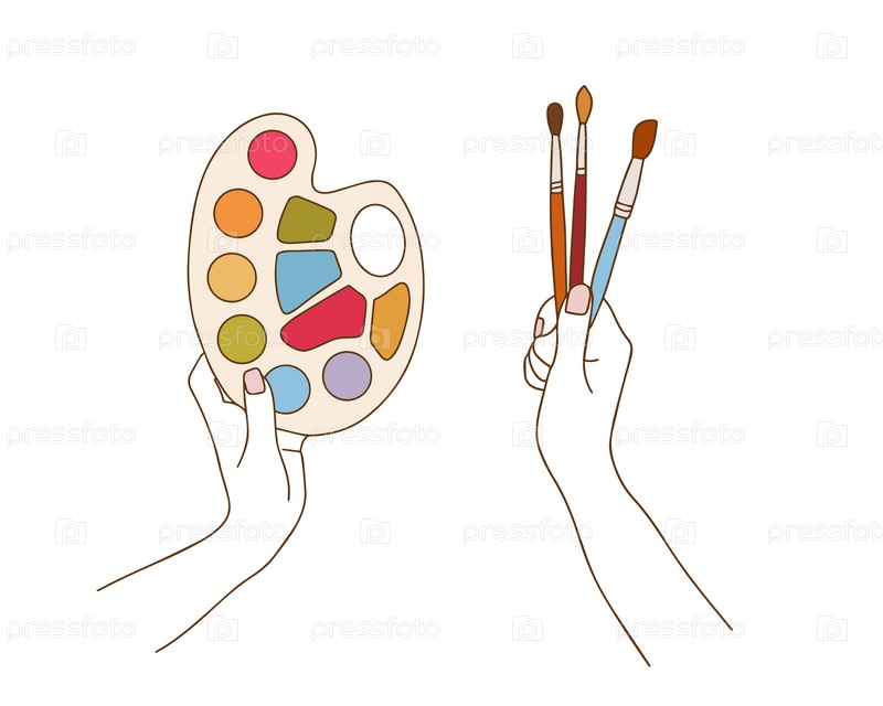 Руки художника держат кисти и палитру. Инструменты художника нарисованы линией, изолированы на белом фоне. Международный день художника. Вектор