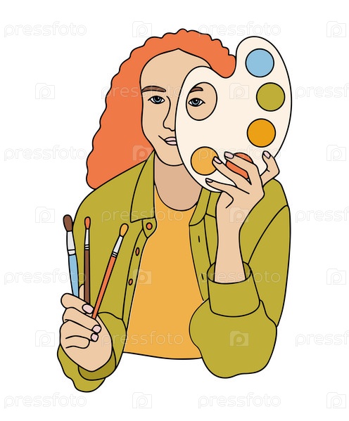 Милая девушка-художница держит кисти и палитру, чтобы создавать искусство. Минималистская концепция профессии, искусства, работы, творчества. Международный день художника. Модная красочная иллюстрация