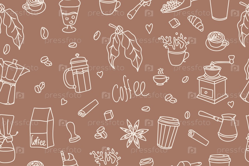 Кофейный рисованный бесшовный узор для упаковки, текстиля, печати. Современный дизайн фона с чаем и кофе. Фон Мокко Мусс