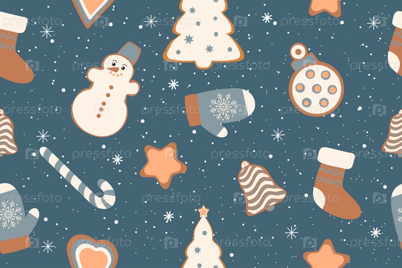 Зимний бесшовный узор с рождественскими фигурками, пряничным печеньем. Модный праздничный фон. Рождественская повторяющаяся текстура для дизайна поверхности, обоев, ткани, упаковочной бумаги и т. д. Вектор