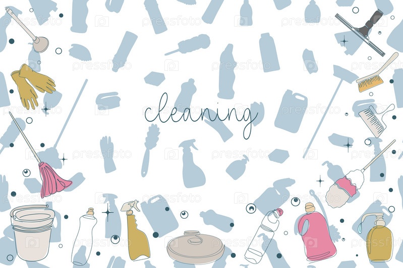 Баннер оборудования для уборки в стиле каракули. Значки линии уборки. Линия нарисованного вручную оборудования, чистящих средств и инструментов для мытья и дезинфекции дома, окон, зеркал. Вектор