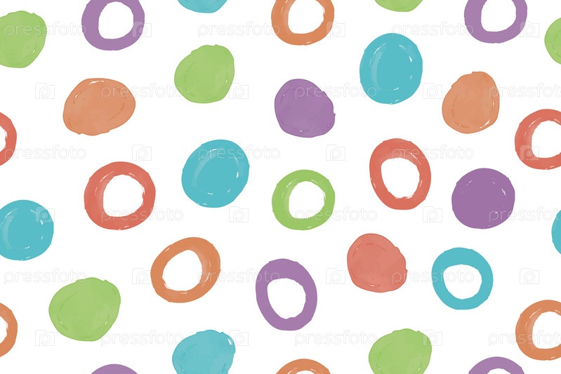 Векторный бесшовный узор из разноцветных кругов, шаров, клякс. Нарисованный орнамент. Набор акварельных фигур. Акварельные пятна. Векторная иллюстрация