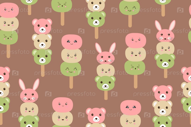 Японский десерт данго с 3 разными цветами. Бесшовный узор традиционного десерта на фоне цвета мокко-мусса