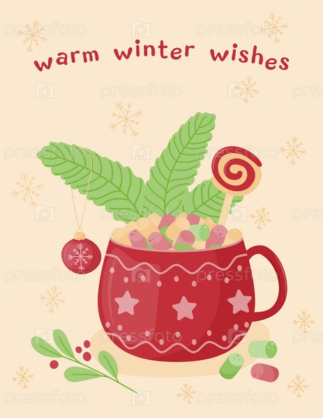 Теплые зимние пожелания. Поздравительная открытка с изображением красной чашки с зефиром и карамелью