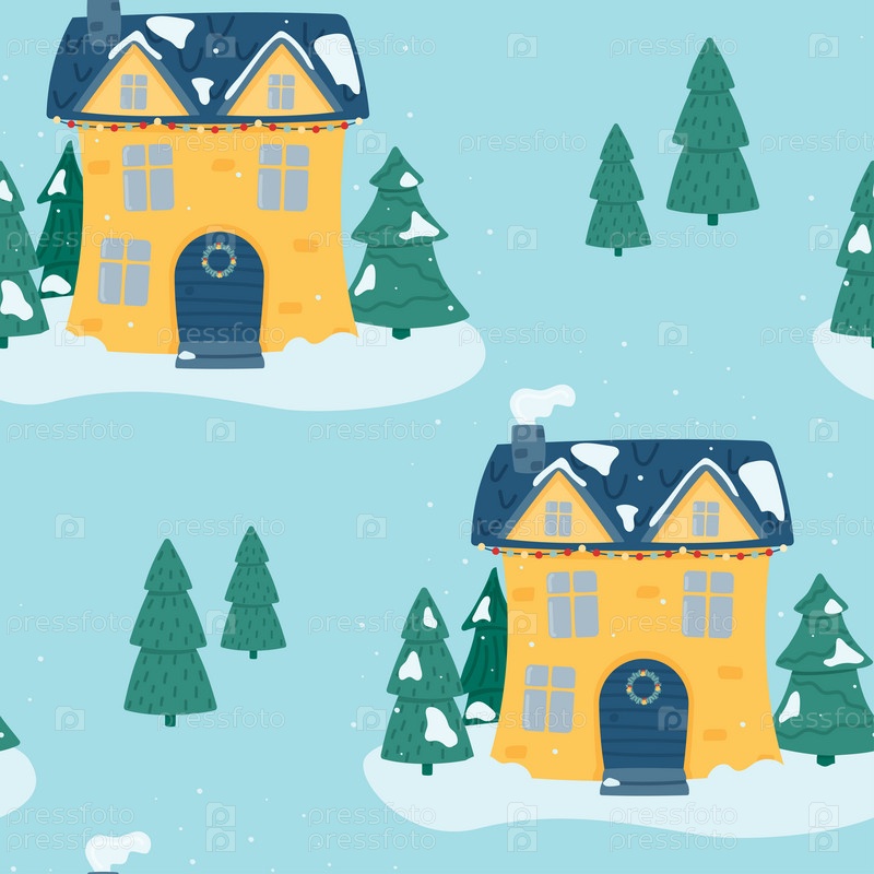 Бесшовный узор из разноцветных домов и елей