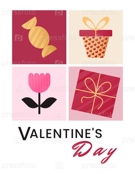 Валентинка с романтическими символами Дня святого Валентина - подарочными коробками, цветком, конфетой
