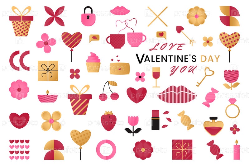 Набор элементов с романтической символикой - фигурки сердец, сладости, подарки, свечи, воздушные шары, замок и ключ, помада, воздушные поцелуи