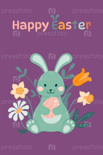 Пасхальный кролик сидит и держит в лапках пасхальное яйцо на фоне цветов