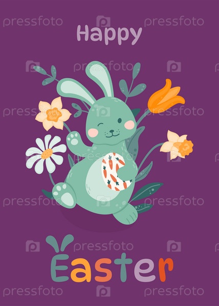 Пасхальный кролик машет рукой и держит в лапках пасхальное яйцо на фоне цветов